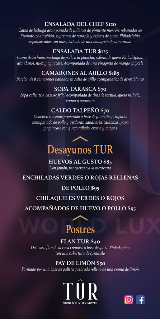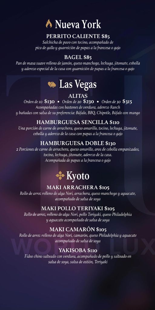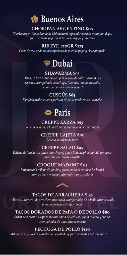 Porque sabemos que los sabores te transportan, nuestro menú internacional te ofrece dos platillos de cada ciudad (con room service, por supuesto). Pruébalos acompañado de tu bebida de preferencia y revive tu luna de miel una y mil veces.